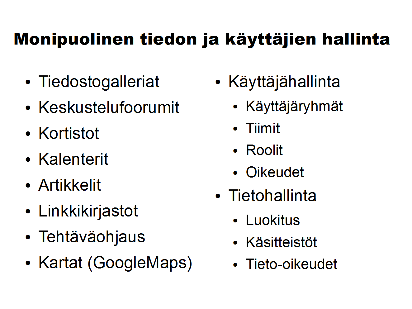 Google Workspace mahdollistaa laajan yhteiskäyttöisen ja jaetun tietovaraston. Se sisältää myös toimistotyökalut tekstinkäsittelyyn , jaettuun tiedostokäsittelyyn , taulukkolasketaan, esitysgrafiikkaan ja lomakkeisiin. Siihen sisältyy myös sähköposti, kalenterit, sivuston tuotanto ja ylläpito, etäneuvottelu- ja viestintätyökalu ja paljon muita keskeisiä työkaluja mitä tarvitan verkostotoiminnassa. Tähän on saatavissa Google Workspace perustamisen opastusta, käyttöönotto- ja suunnitteluapua.